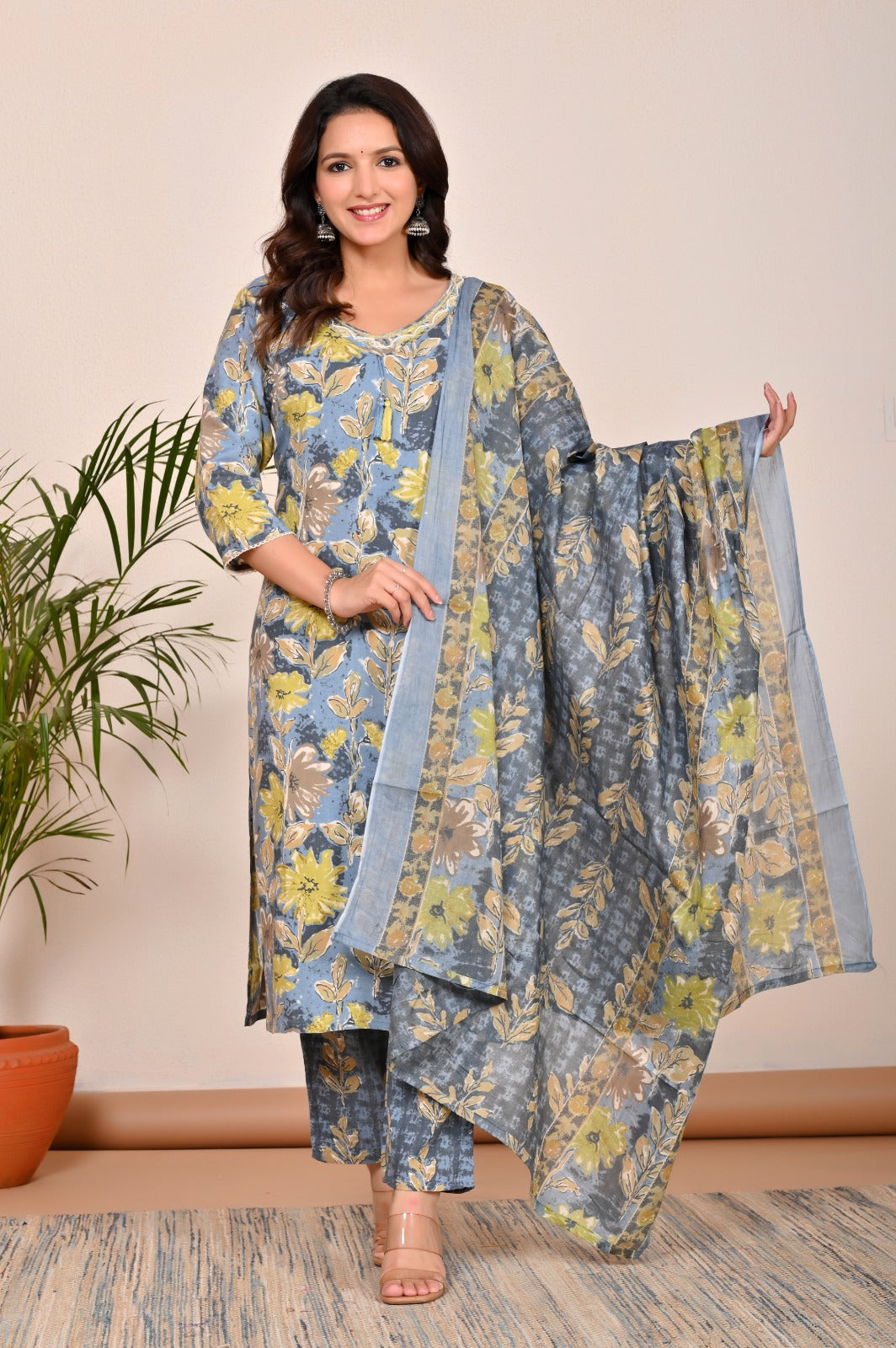 The kurta features a relaxed straight-cut silhouette with a round neckline and quarter sleeves, making it a perfect choice for all-day comfort. Paired with coordinated bottoms and a feather-light mulmul dupatta, adorned with matching floral prints and a soft drape, this set beautifully balances tradition and modernity.