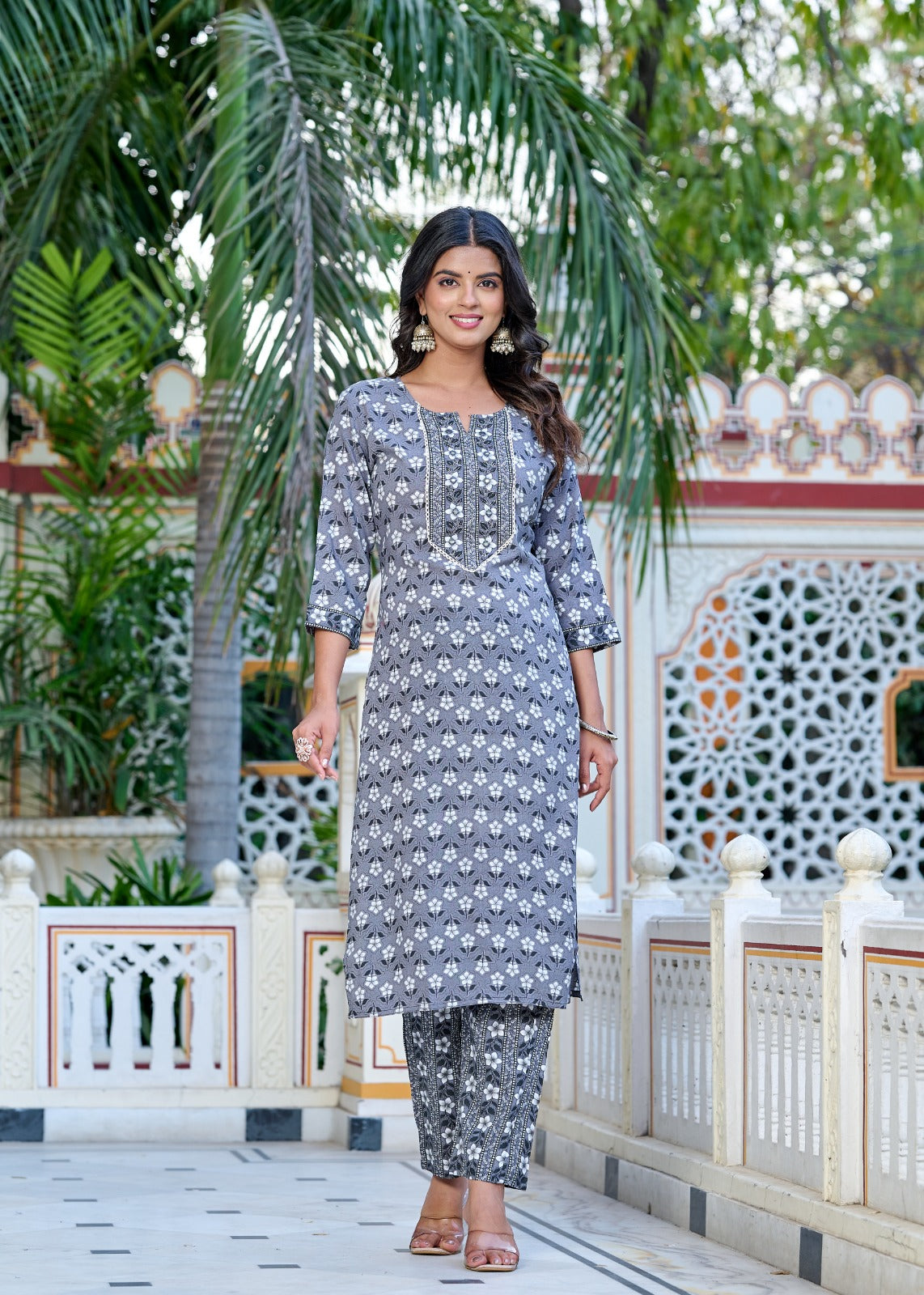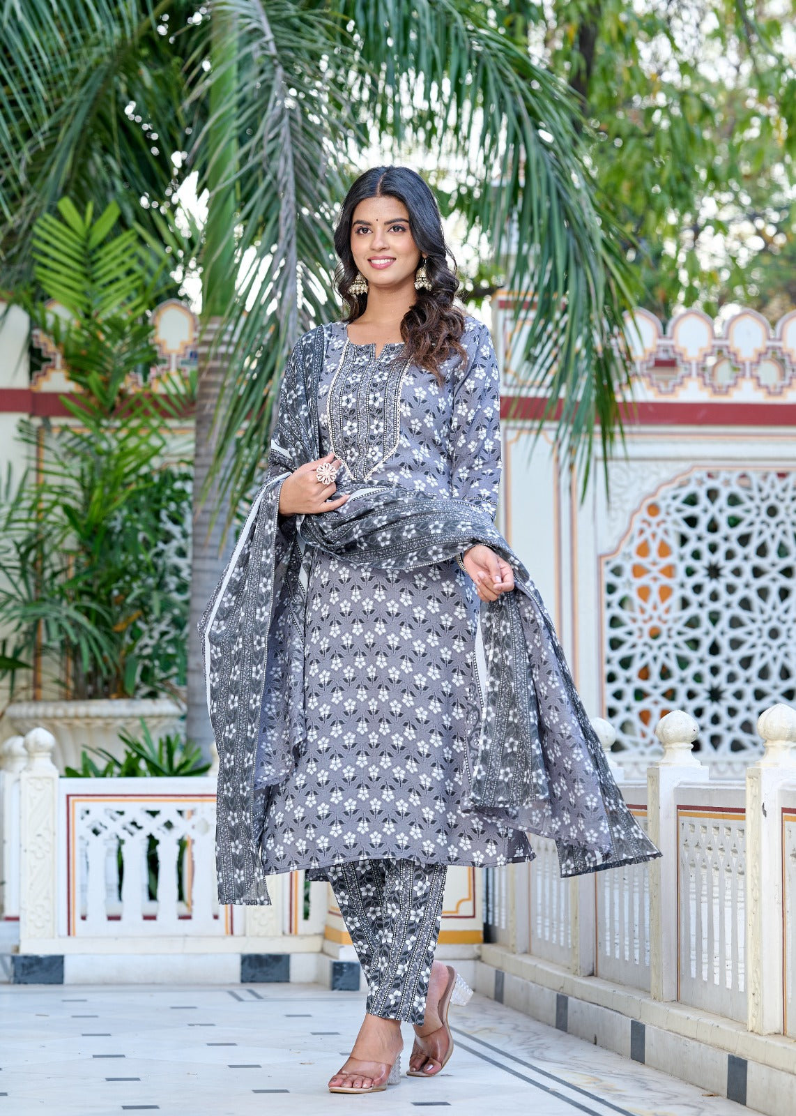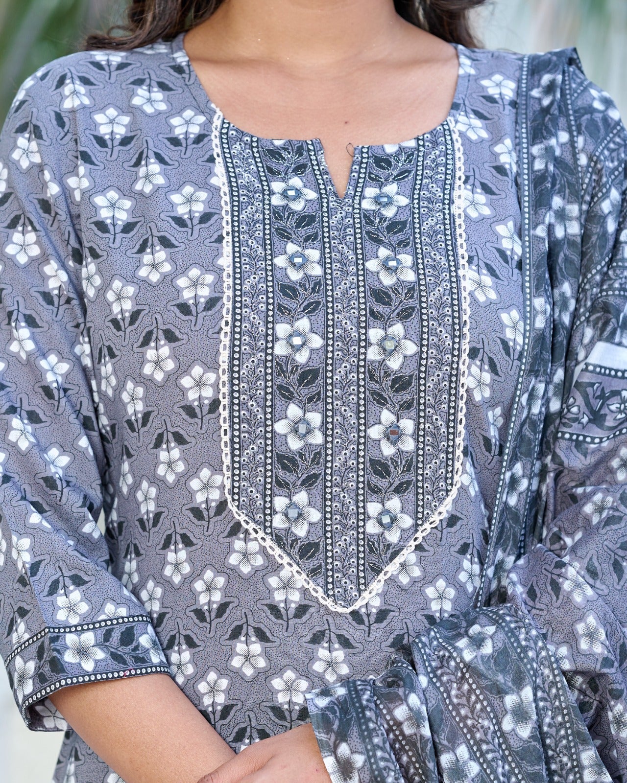 Crafted from soft, breathable premium rayon fabric, this minimalistic ensemble features a sleek gray base adorned with subtle yet stylish detailing, making it perfect for both office wear and casual outings. The straight kurta is paired with a matching pant and a coordinating lightweight dupatta, offering a balanced blend of comfort and charm.