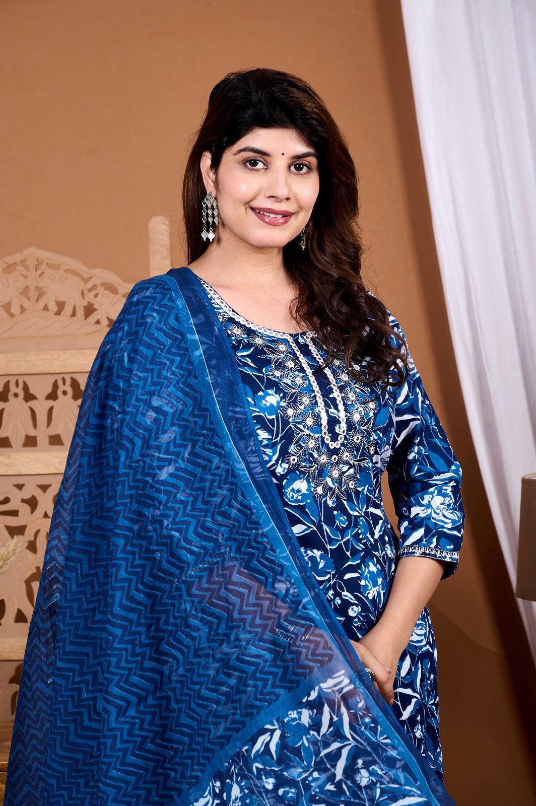 Step into timeless elegance with the Nilofer Bloom Rayon Suit Set. Crafted from soft and breathable rayon fabric, this stunning three-piece set features a vibrant blue floral-printed kurta paired with matching pants and a beautifully detailed dupatta. The intricate mirror and thread work on the neckline adds a touch of festive sparkle, making it perfect for both everyday grace and special occasions. Flowing, flattering, and effortlessly chic — this set blends tradition with contemporary style for the modern woman.